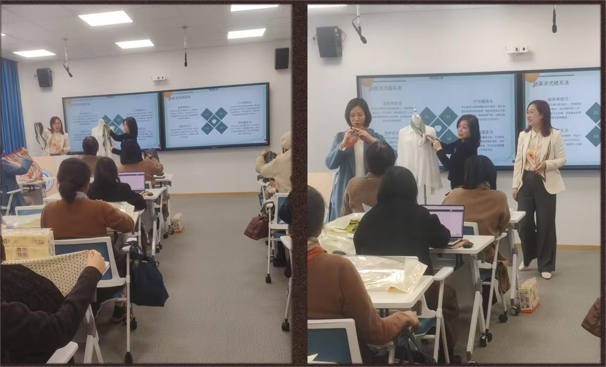 随后,陈晶女士以专业视角展开分享,她结合自身作为文化部认证色彩搭配师、日本COLOR TOP 形象顾问及意大利 MKS 时尚学院认证顾问的丰富经验,从色彩理论、风格定位入手,细致讲解了不同材质、花色丝巾与肤色、服饰的适配技巧。在实操演示环节,陈老师现场示范了法式结、蝴蝶结、披肩式等多种经典丝巾系法,一边操作一边拆解步骤,还邀请教师代表上台互动,手把手指导调整细节,让抽象的美学知识变得直观易懂。台下老师们也纷纷拿出自备的丝巾,跟着老师同步练习,认真记录要点,在轻松愉悦的氛围中感受着方寸丝巾的百变魅力。