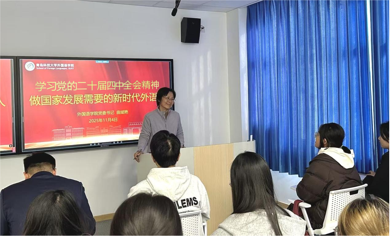 根据《中共青岛科技大学委员会学习宣传贯彻党的二十届四中全会精神工作方案(草案)》,为在学院迅速掀起学习宣传贯彻党的二十届四中全会精神热潮,11月4日,外国语学院党委书记曲斌艳以《学习党的二十届四中全会精神,做国家发展需要的新时代外语人》为题,为联系班级讲授专题思政课。