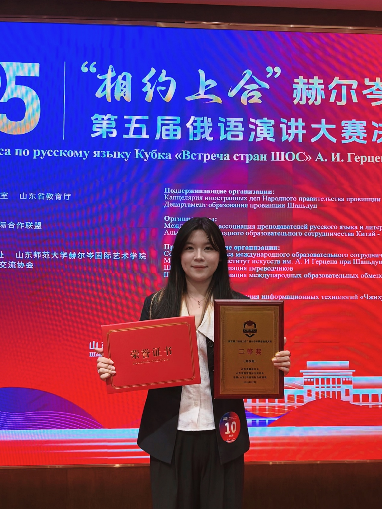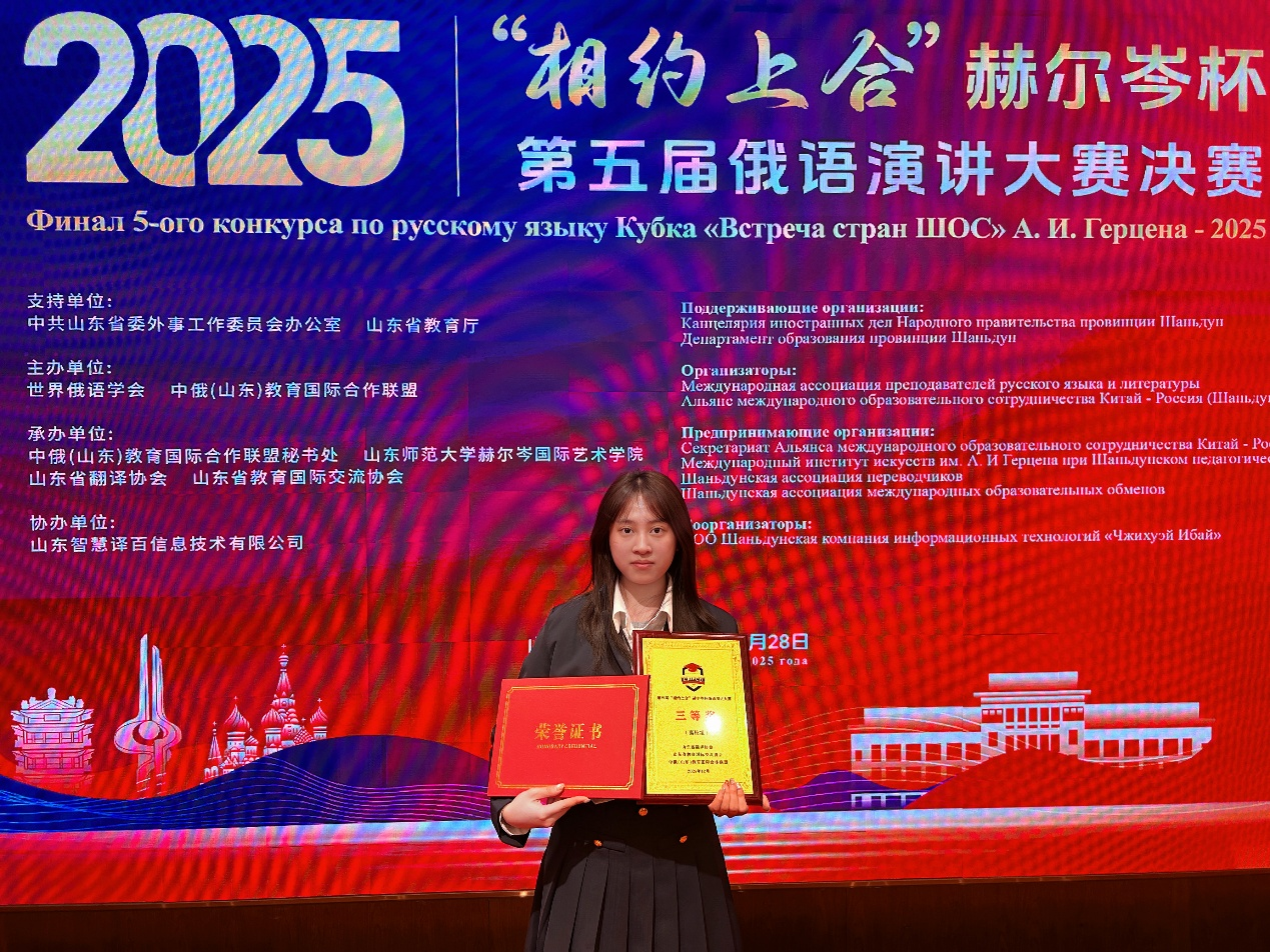 2025年12月28日,第五届“相约上合”赫尔岑杯俄语演讲大赛决赛在山东师范大学(千佛山)校区成功举办。在汇集全国60名决赛选手的激烈角逐中,我院俄语专业毛庆玲同学获高校组二等奖,廖倩倩获三等奖。同时,我校获“大赛优秀组织单位奖”,蒋春丽老师获“优秀指导教师奖”。